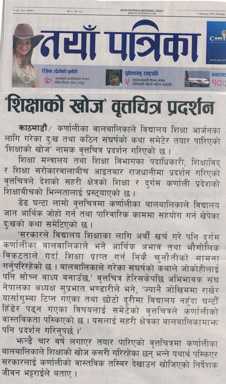 ज्यानै जोखिममा राखेर यार्सागुम्बा टिप्न गएका तथा छोटो दुरिमा विधालय नहँुदा घन्टौँ हिडेर पढ्न गएका विषयलाई समेटेको वृतचित्रले कर्णालीको वास्तविकता पस्किएको छ । यसलाई शहरी क्षेत्रका विधार्थी माझ पनि प्रर्दशन गरिनु पर्दछ ।